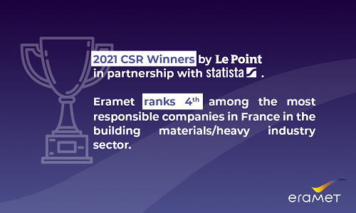 This is a new mark of recognition for Eramet’s CSR performance: after being ranked in the first decile of the Mining and Metals sectors by the two specialist agencies Vigeo Eiris (in 2019) and ISS ESG (in June 2020), the Group has just been awarded a place in the top 250 companies in the “2021 Socially Responsible Companies” ranking. In the “Building Materials and Heavy Industry” category, Eramet was ranked fourth out of ten. In the “Building Materials and Heavy Industry” category, Eramet was ranked fourth in the top five; and in the “Governance” category, 47th out of 50.
